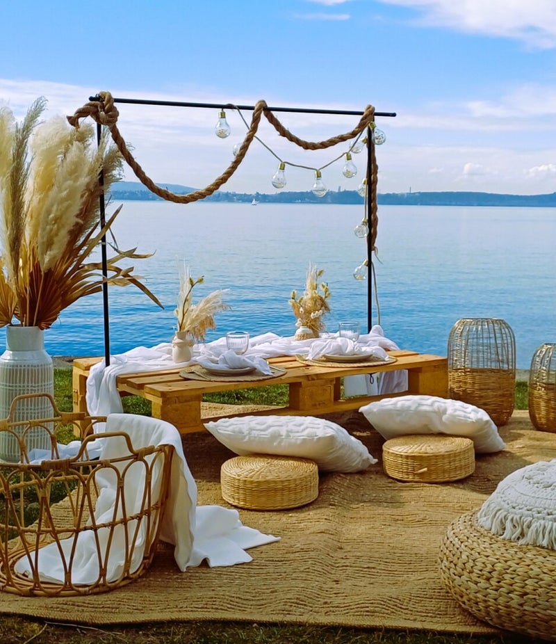 Beige, Weiß, Gold und Naturtöne bestimmen dieses Konzept. Leichtigkeit im Bohostil, ein Traum in hellen Tönen. 2 bis 25 Personen